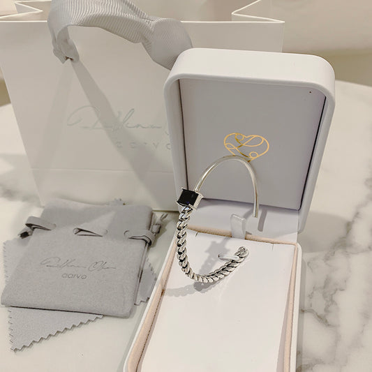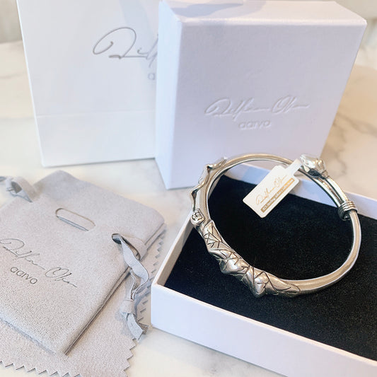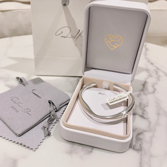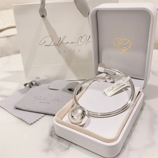 Embrace modern sophistication with this stunning silver open cuff bangle. Featuring a unique asymmetrical design with a polished sphere on one end and a clean, geometric cube on the other, this piece is a true work of wearable art. Its sleek, sculptural form wraps elegantly around the wrist, making it the perfect statement of refined, contemporary style. Wear it alone for a minimalist look or stack it with other bracelets for added impact.