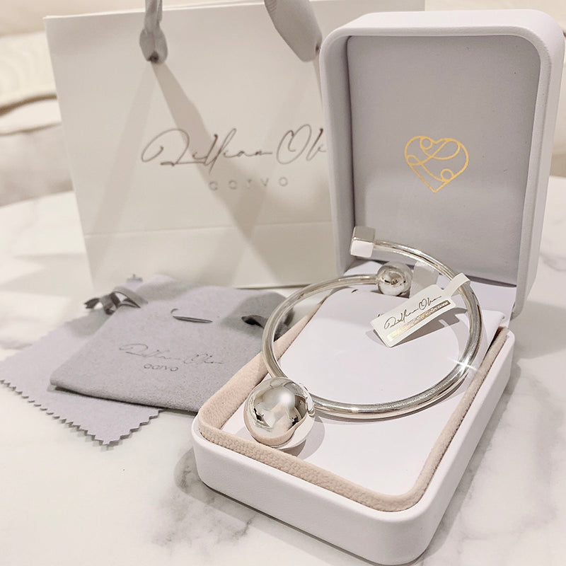 Embrace modern sophistication with this stunning silver open cuff bangle. Featuring a unique asymmetrical design with a polished sphere on one end and a clean, geometric cube on the other, this piece is a true work of wearable art. Its sleek, sculptural form wraps elegantly around the wrist, making it the perfect statement of refined, contemporary style. Wear it alone for a minimalist look or stack it with other bracelets for added impact.
